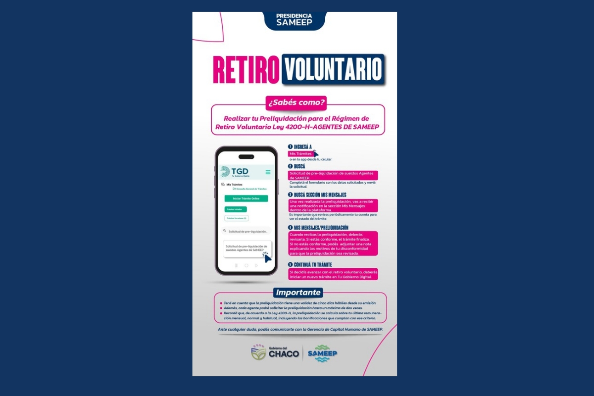 Los interesados deberán iniciar el trámite a través de la plataforma digital Tu Gobierno Digital, ingresando a la sección “Mis Trámites”. El primer paso consiste en solicitar una preliquidación mediante el trámite denominado “Solicitud de pre-liquidación de sueldos Agentes de SAMEEP”, donde deberán completar los datos requeridos.